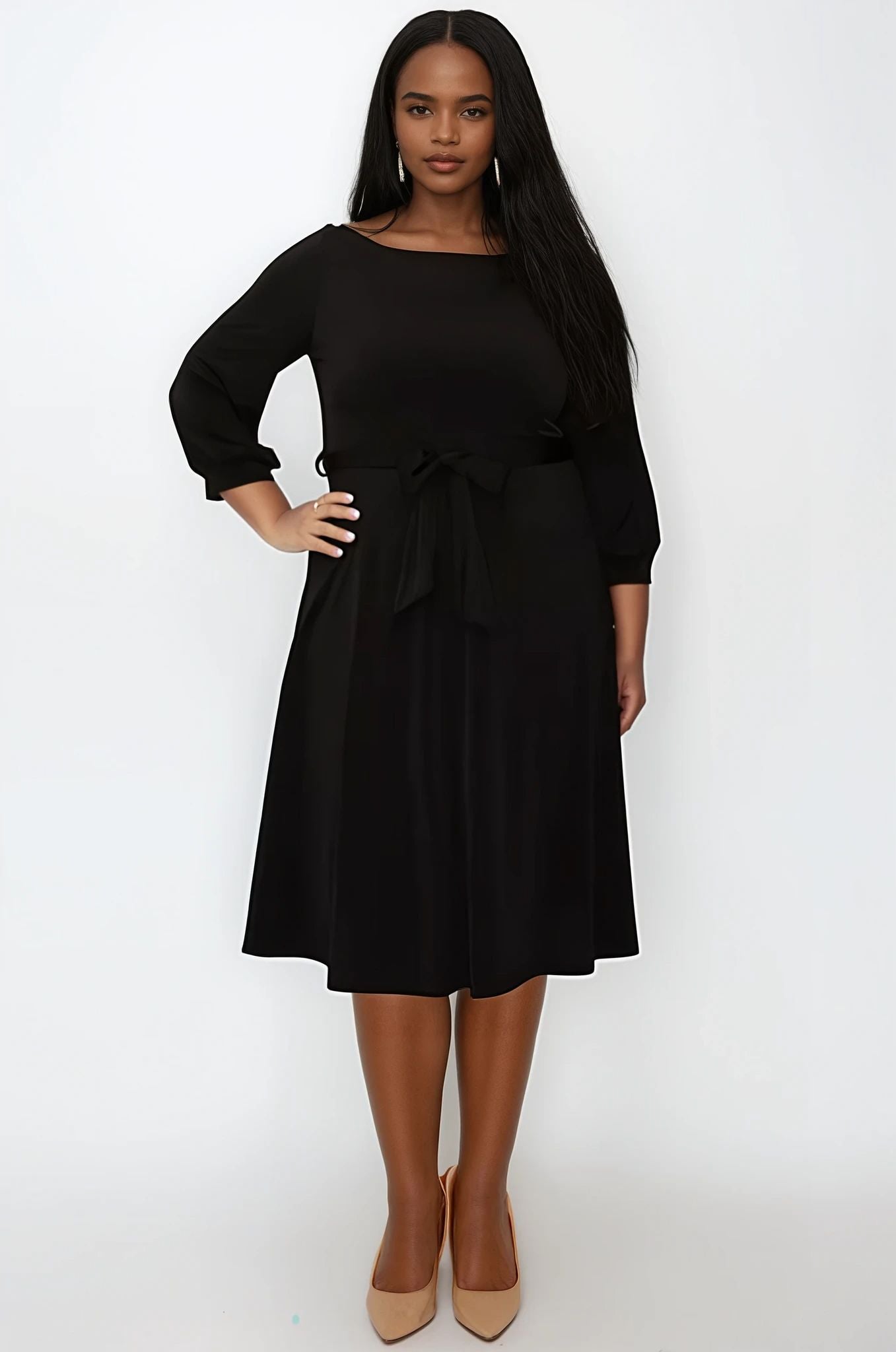 This knee-length black wrap dress offers excellent stretch for comfort and ease of movement. Featuring a removable tie, it allows for a customizable fit, while the 3/4 sleeves provide a polished, professional look suitable for the workplace. Its versatile design combines style and practicality, making it an essential addition to your work wardrobe.